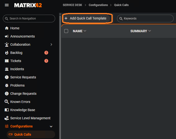 Navigere zu Administration > Service Desk > Configurations > Quick Calls und erstelle ein neues Quick Call Template.