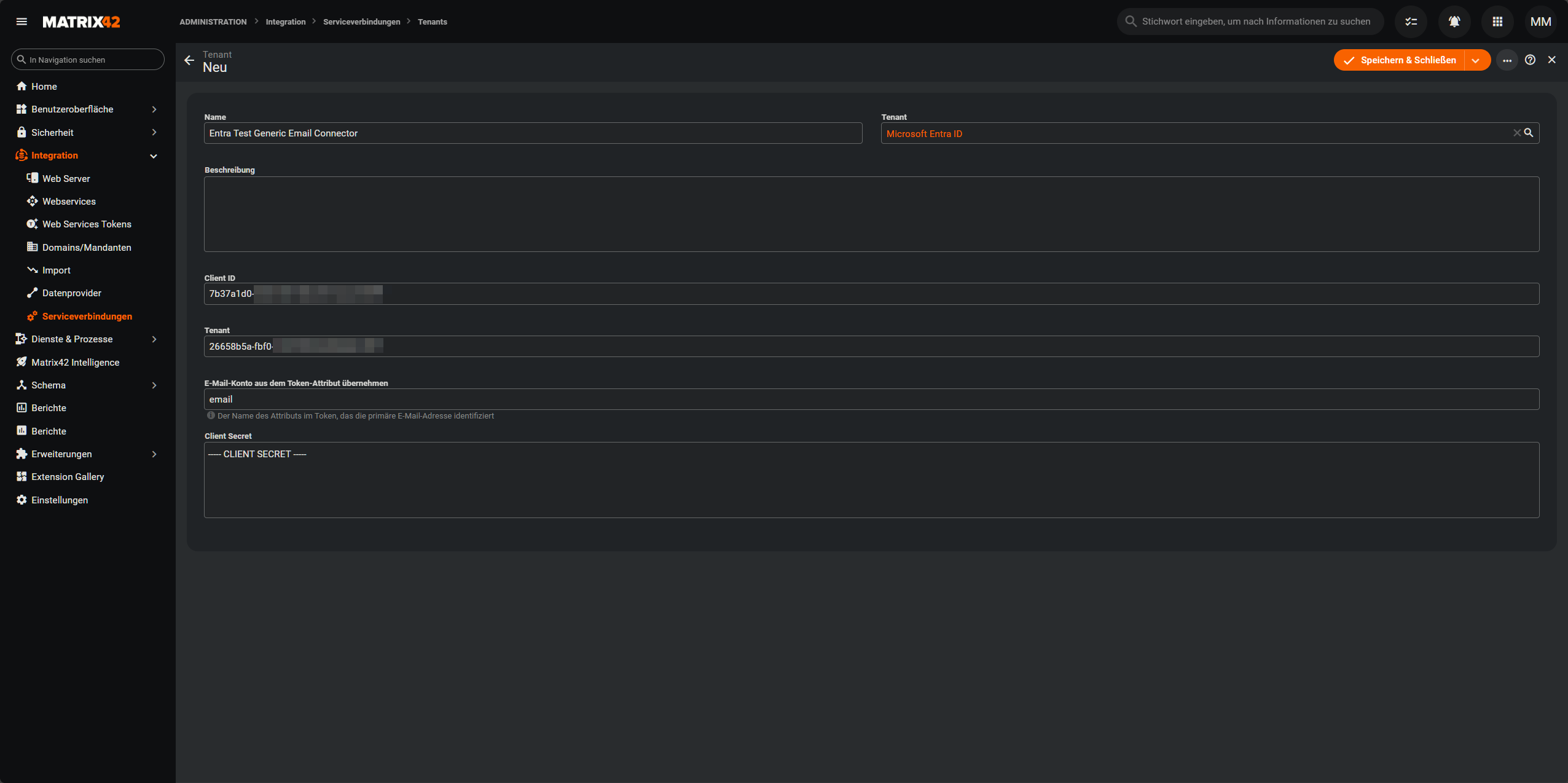 Administration > Integration > Serviceverbindungen > Tenantsund erstelle einen neuen Tenant.- Trage bei