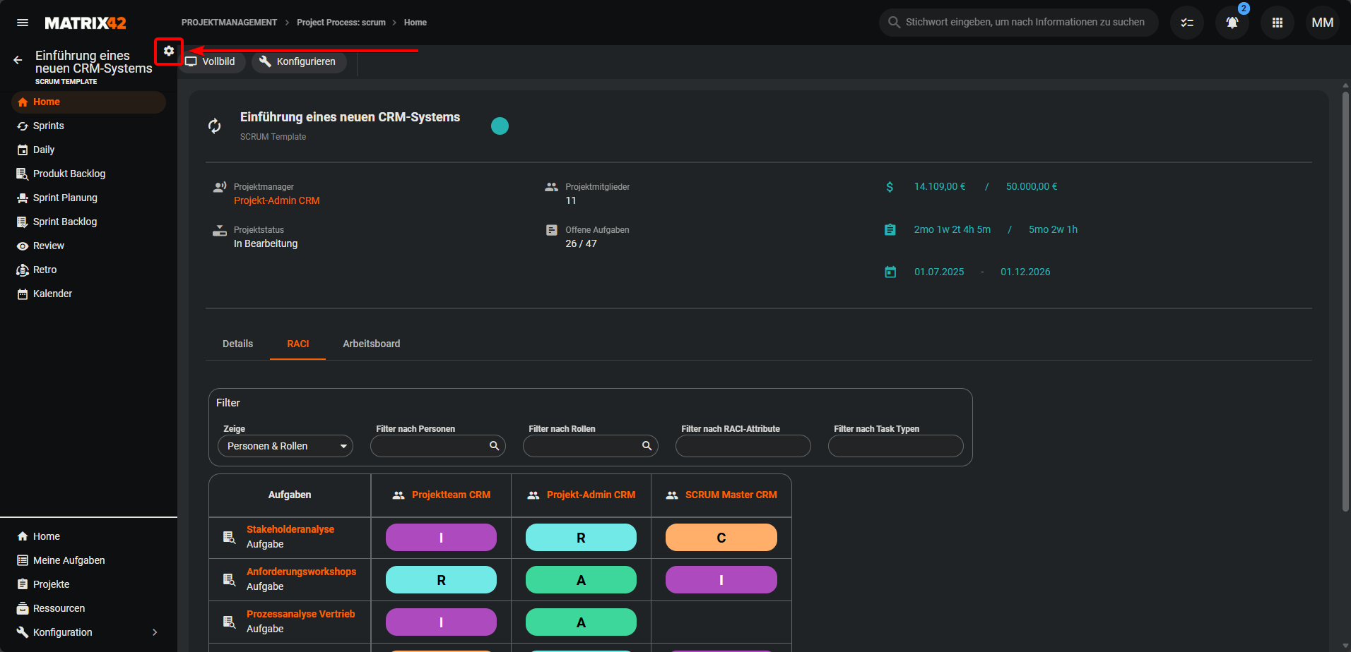Direkt aus der Projektansicht über das Zahnrad-Symbol, welches in den Bearbeitungsdialog des Projekts führt.