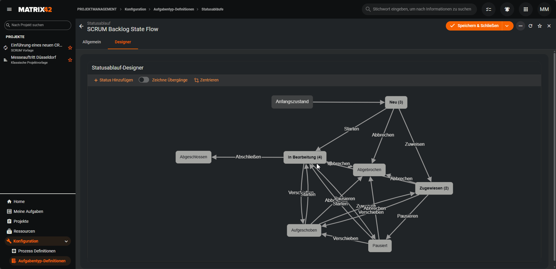 Die hier hinterlegten Status stehen anschließend im Statusablauf-Designer zur Verfügung und können dort über Übergänge miteinander verbunden werden.