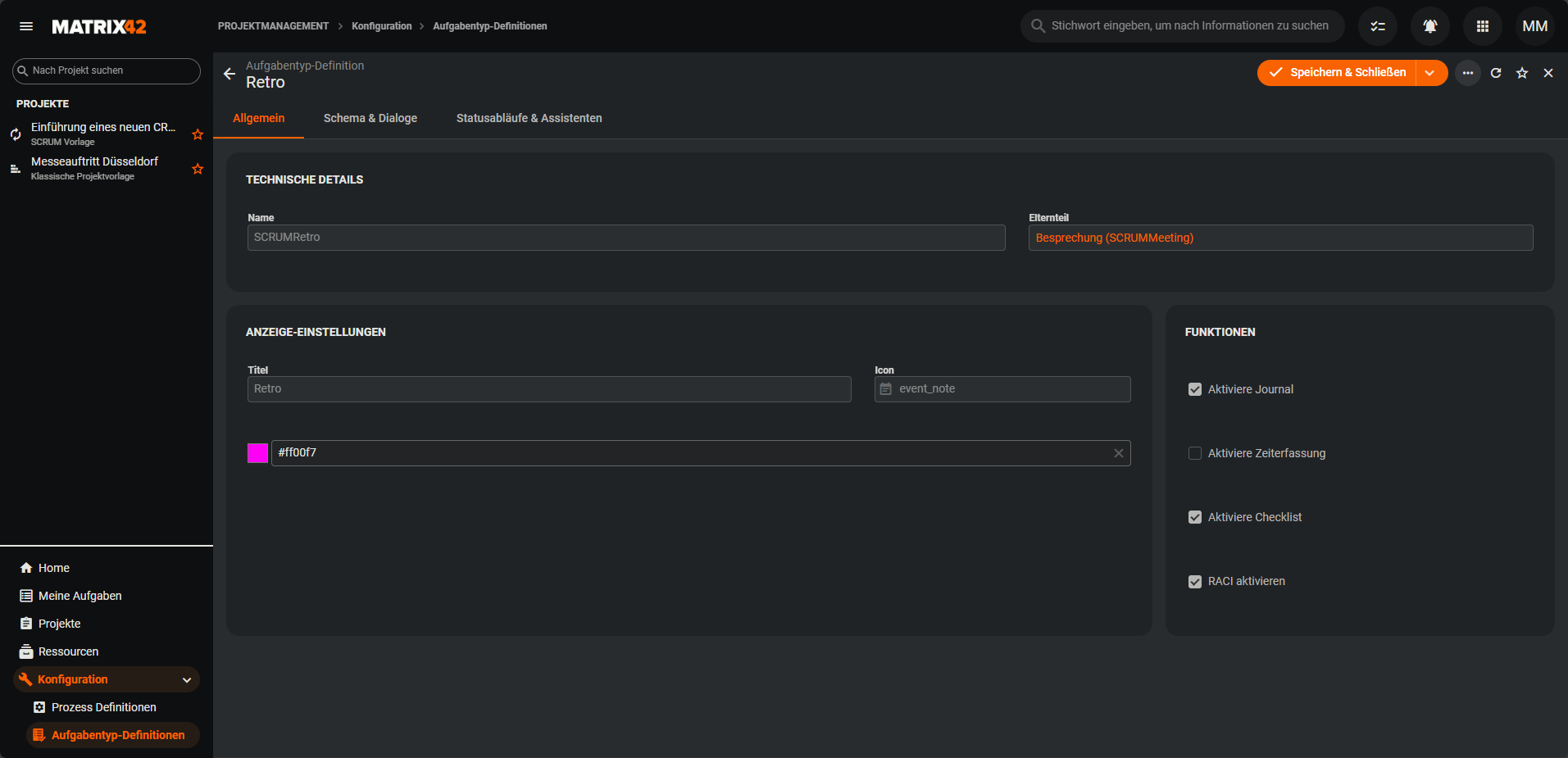 Innerhalb des Prozesses können die Aufgabentyp-Definitionen verknüpft werden, um sie für Projekte zu konfigurieren (siehe hier).