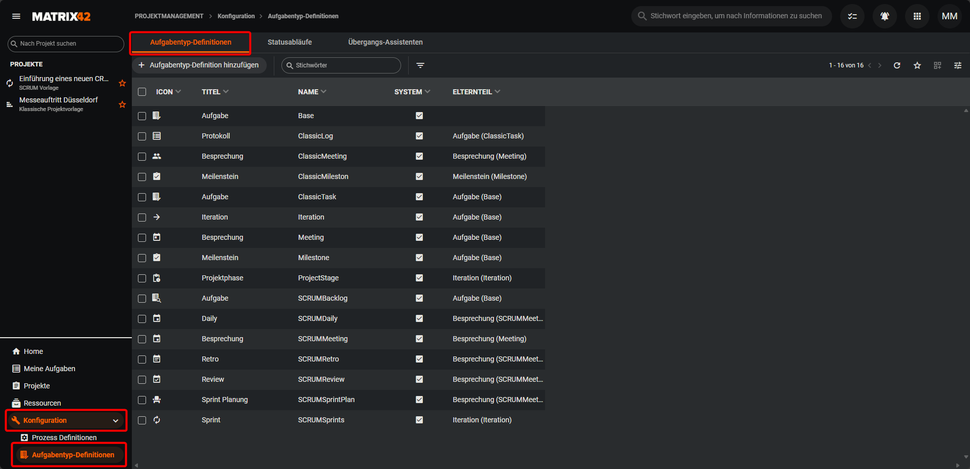 Standardmäßig werden mit dem Project Management mehrere Aufgabentyp-Definitionen ausgeliefert. Die ausgelieferten Aufgabentyp-Definitionen findest du hier.