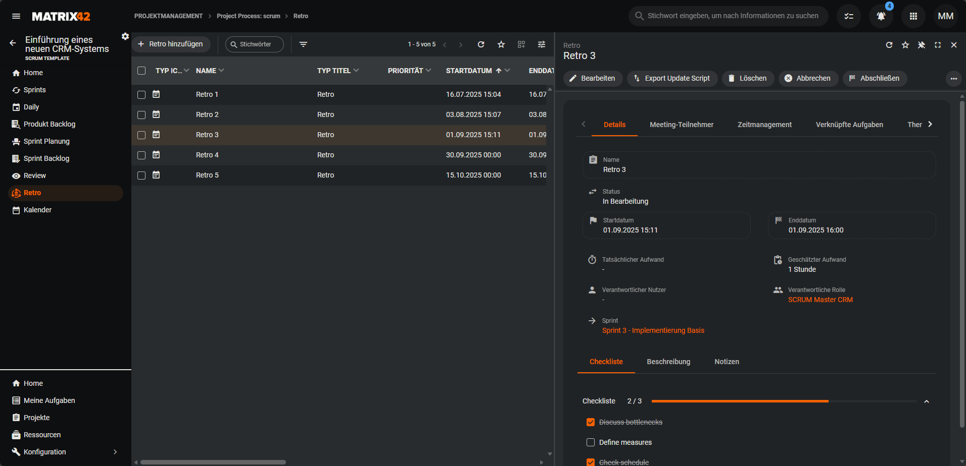 Zeigt die Retros des Projekts in einer tabellarischen Grid-Ansicht oder in einer Kalenderansicht an.