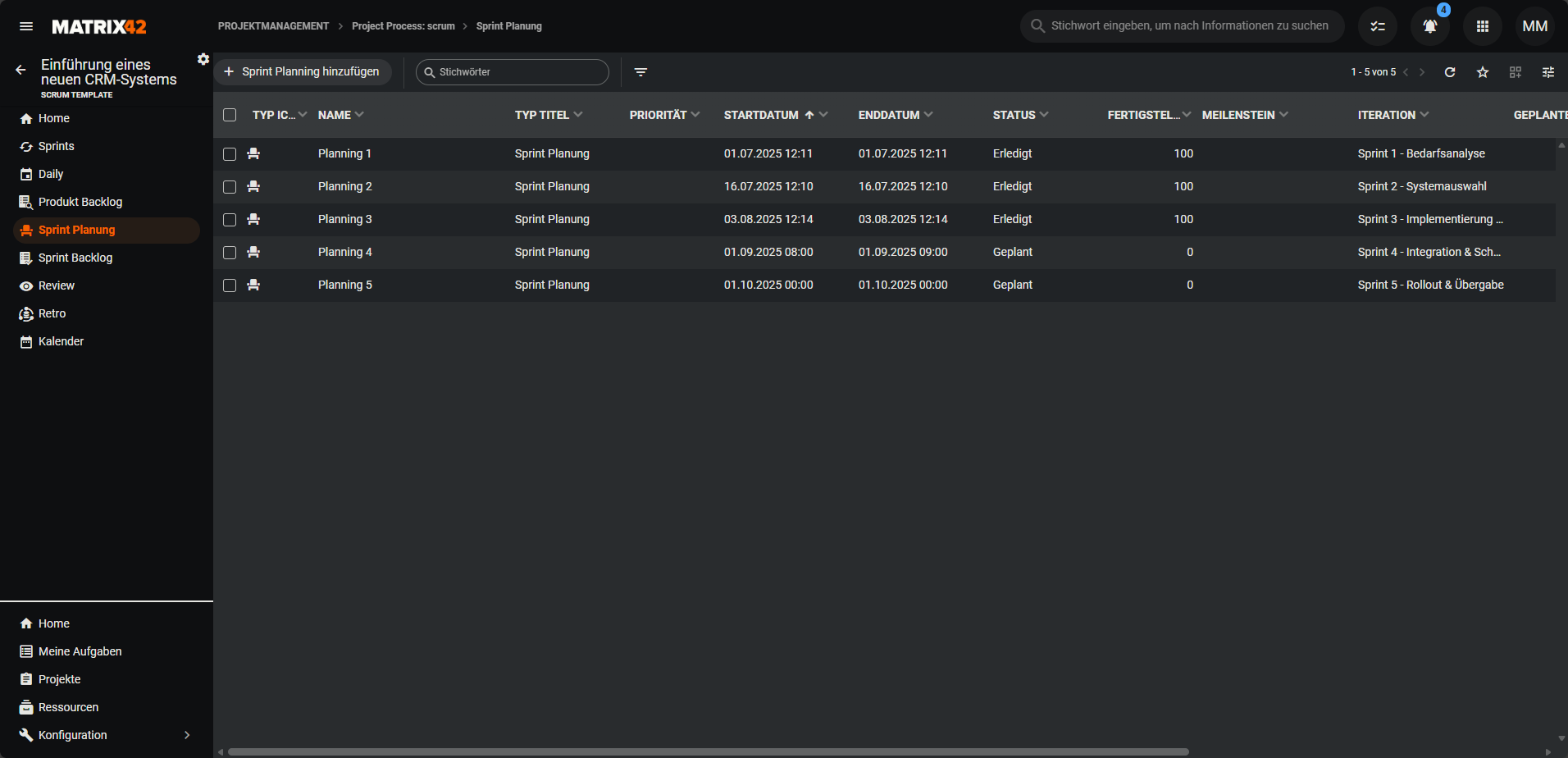 Zeigt die Sprint Planungen des Projekts in einer tabellarischen Grid-Ansicht oder in einer Kalenderansicht an.