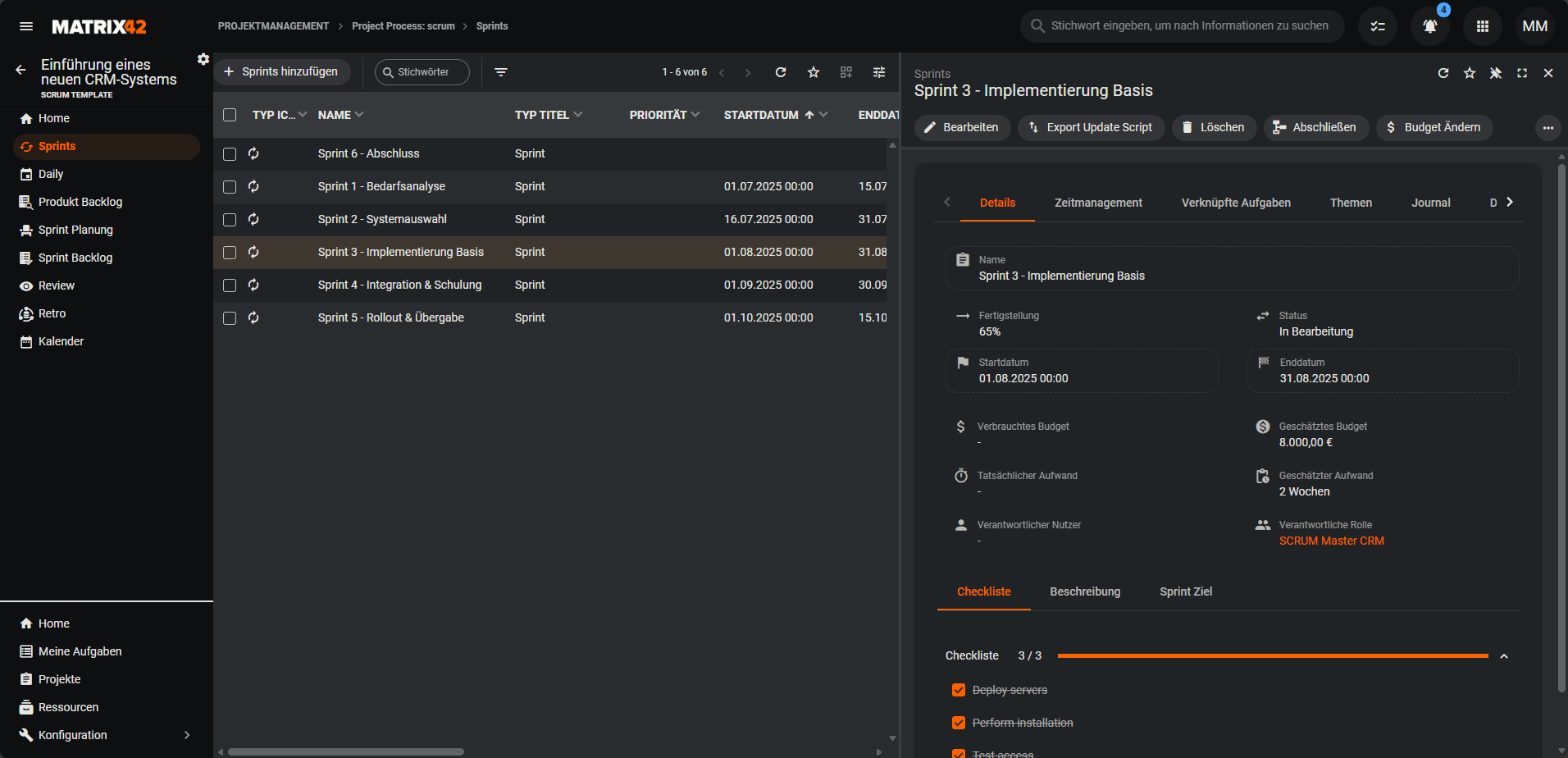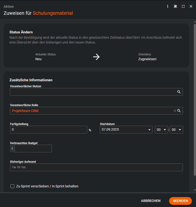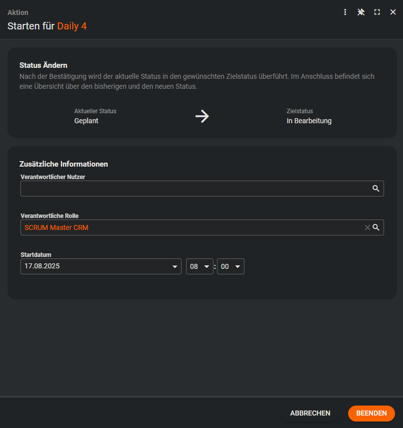 Ein Sprint ist ein fest definierter Zeitraum in SCRUM. Sprints haben eine feste Dauer (meist 1–4 Wochen) und enthalten Planung, Umsetzung, Review und Retrospektive. Ziel eines Sprints ist es, einen klar definierten Mehrwert zu liefern. Im Dialog eines Sprints werden das Start- und Enddatum automatisch vorbefüllt. Dabei wird stets die Zeitspanne des Start- und Enddatums des zuerst erstellten Sprints verwendet.