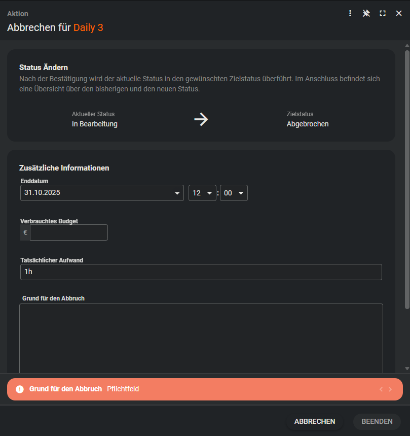 | Begründung des Abbruchs | Text |