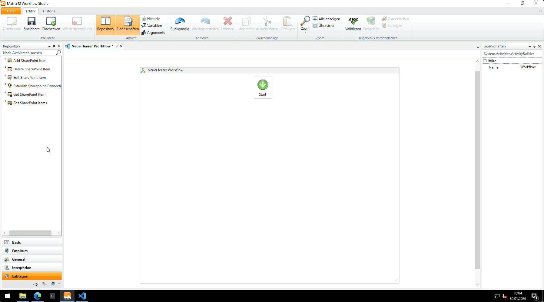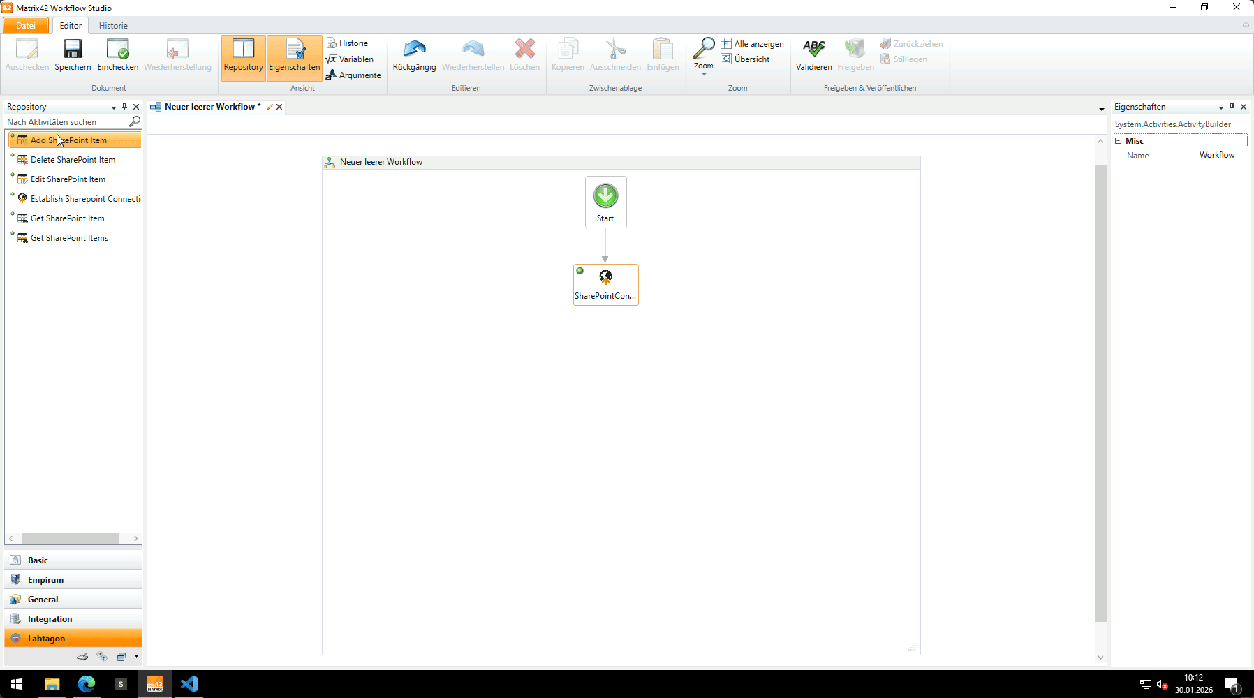 - Füge die Workflow Aktivität Establish SharePoint Connection hinzu: